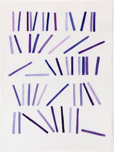 Five rows of pink, purple, lavendar and blue painted lines on a light pink background. While the lines on the top row are mostly vertical, the rows below include lines painted at different angles, giving the impression of movement or of falling.