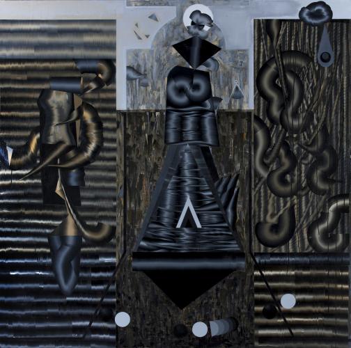 The abstract artwork displays numerous hair-like coils woven in different geometric shapes around a black and grey pendulum in the centre of the image with a grey ball swinging side to side. The coils are twisted together on either side of the pendulum in different shades of grey, silver, brown and gold.