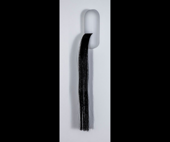 The sculpture is a white rounded spherocylinder capsule shaped like a pill attached to a white wall. Long black hair flows approximately two-thirds down out of the capsule. In the background is the grey shadow of the hair and capsule on the wall.