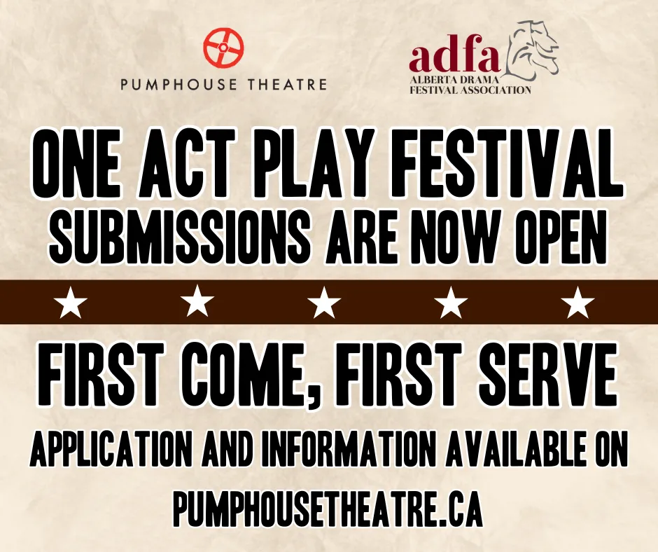 The Pumphouse Theatre has presented the Calgary Region One-Act Play Festival with the Alberta Drama Festival Association for over 30 years and we are excited to do so again! Registration for 12 spots will open on a first-come, first serve basis beginning September 17th, 2025 at 12 pm. The Festival is scheduled to be held April 1 – 4, 2026, in the Victor Mitchell Theatre.
