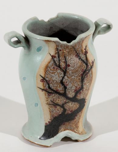 The form of her pots reflects the soft contour of Korean traditional architecture. She also use Puncheong techniques from the Chosun Dynasty to show doily designs. She employ these techniques in order to recreate the harmony of her two cultures.