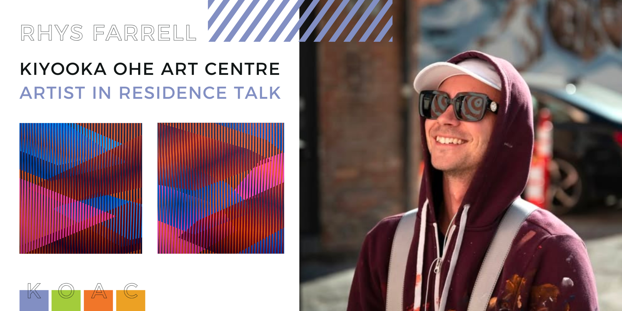 While in residence, Rhys will develop a new body of work, sharing his research and creative process along the way. Engaging with the community, sharing his interests and ideas, as well as providing a unique experience for each viewer is an important aspect of his practice as an artist - he shares, “it is why I make art.” Throughout his residency, Rhys will explore the colours and patterns at the Kiyooka Ohe Arts Centre to develop a new exciting body of work inspired by his surroundings. We can’t wait to see his new creations bound to be infused with optical curiosity!