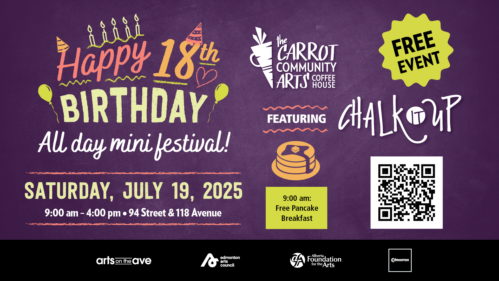 Celebrate The Carrot’s 18th Birthday on July 19, 2025, with an unforgettable day of Chalk-It-Up fun! Watch chalk artists create stunning masterpieces, enjoy live music, indulge in delicious food, and explore the all-ages Artisan Market. Starting at 9 AM, dive into a day filled with creativity, performances, and good vibes. Bring your loved ones, make memories, and experience a day full of joy, laughter, and artistry. Don’t miss out—this is a celebration you won’t want to miss!