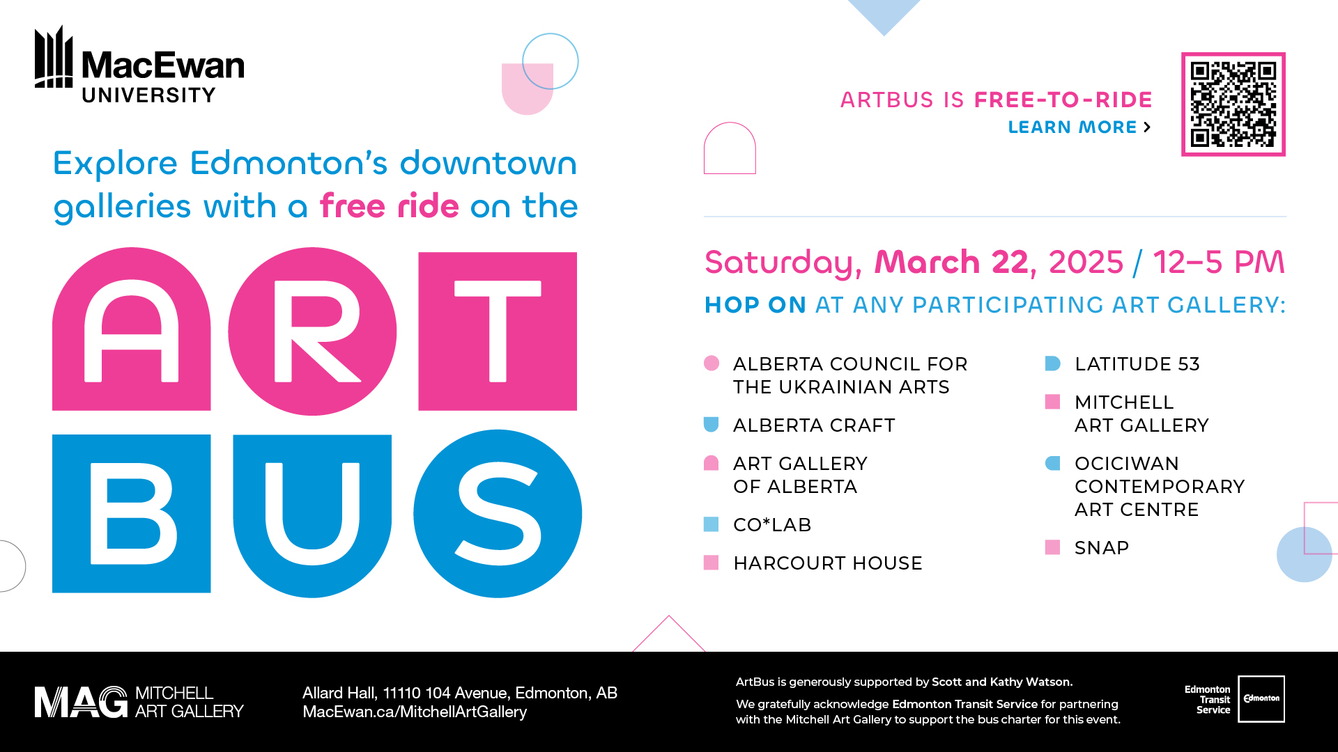 ArtBus is generously supported by Scott and Kathy Watson. We gratefully acknowledge Edmonton Transit Service for partnering with the Mitchell Art Gallery to support the bus charter for this event.