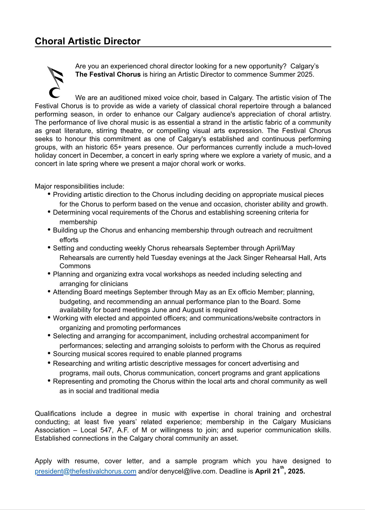 Qualifications include a degree in music with expertise in choral training and orchestralconducting; at least five years’ related experience; membership in the Calgary Musicians Association – Local 547, A.F. of M or willingness to join; and superior communication skills. Established connections in the Calgary choral community an asset.