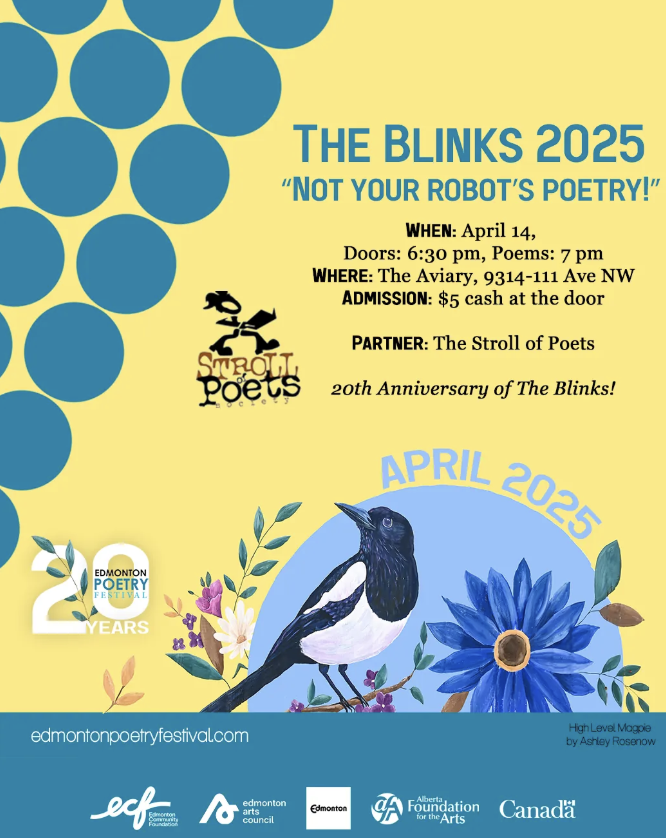The Blinks 2025 is not your robot’s poetry! This year is all about “Putting the Art in Artificial Intelligence”. This event is invented and presented by the Stroll of Poets at the Edmonton Poetry Festival and has been for 20 years, making it one of the Festival’s founding events — and our birthday twin!