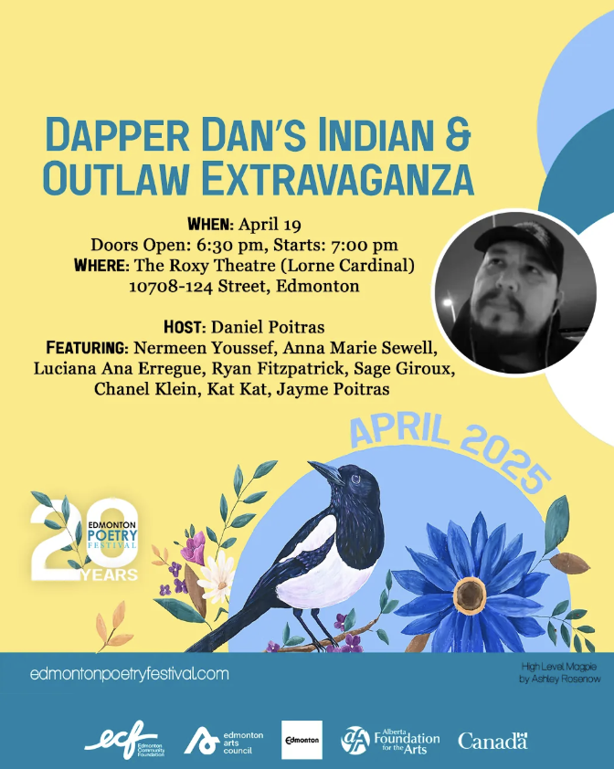 The Edmonton Poetry Festival Society is proud to present, to feature, to showcase, to provide for your viewing and aural pleasure a curated evening of poetics, politics, dance, & culture such as you are not likely to see the likes of any other place but at The Lorne Cardinal Theatre on April 19 as part of Theatre Networks’ celebrated Phoenix Series.
