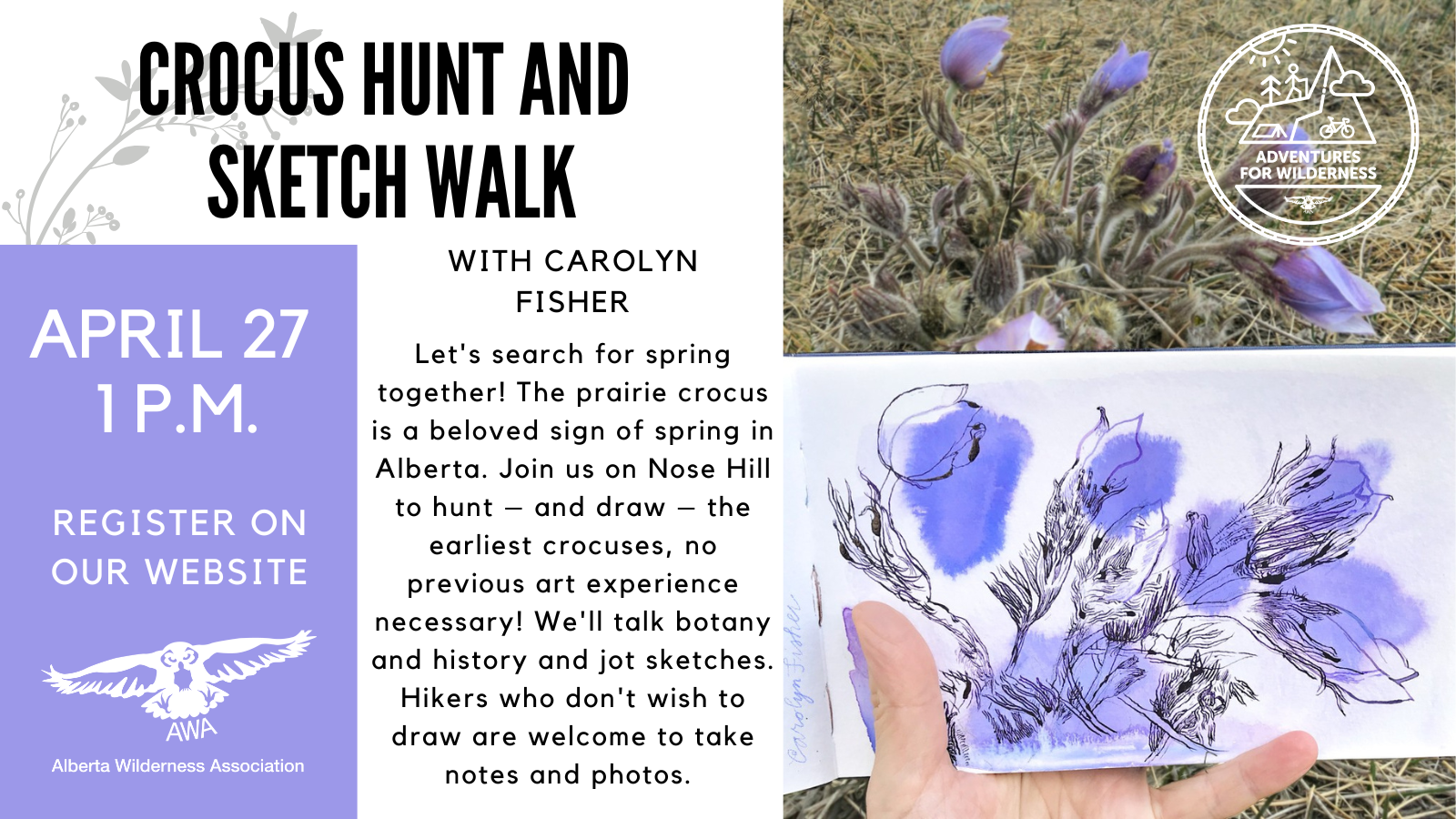 The furry prairie crocus (Pulsatilla nuttalliana) is a beloved sign of spring in Alberta. Join us on Nose Hill to hunt – and draw – the earliest crocuses. We’ll bring our sketchbooks and check the fescue and poke around the south facing slopes. We’ll talk botany and history and jot sketches. Hikers who don’t draw are welcome to take notes and photos. Let’s search for spring together!