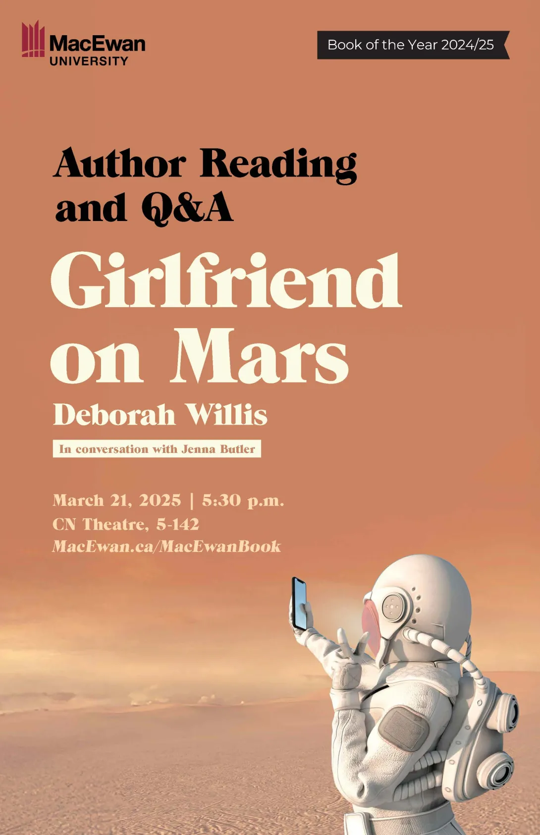 The conversation will be with MacEwan’s 2024-25 Writer in Residence, Jenna Butler. Willis will also be available to sign copies of Girlfriend on Mars which will be available for purchase. Light refreshments will be served.