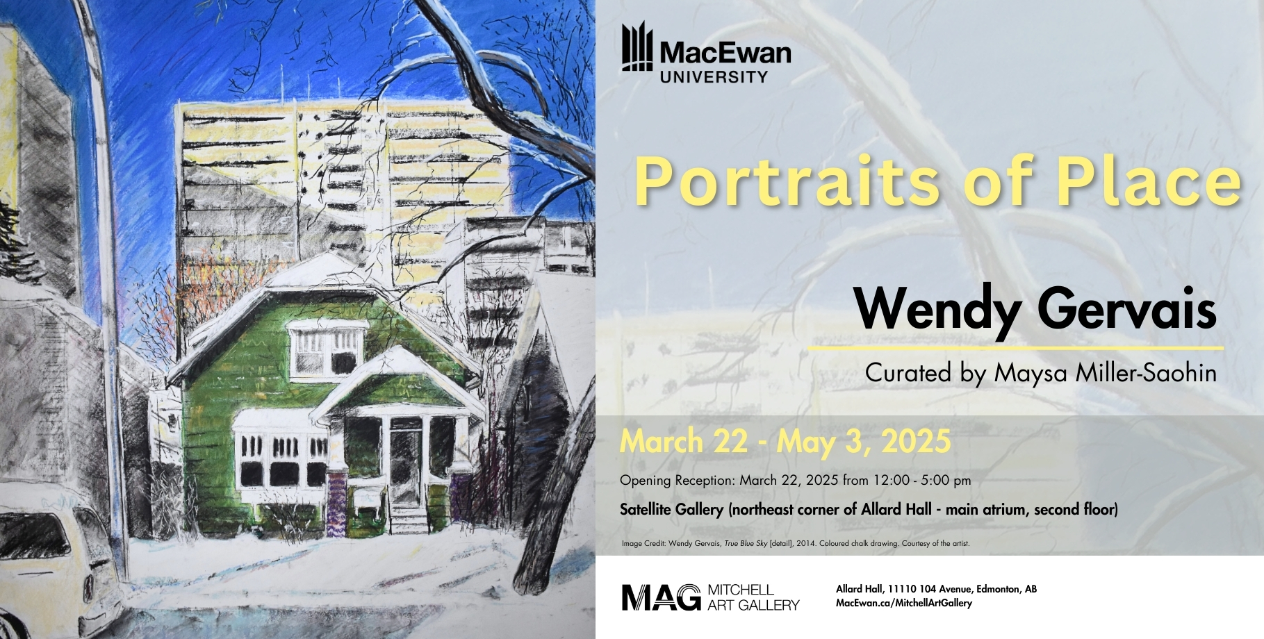 Location: 1110 104 Ave NW, Edmonton, AB — Satellite Gallery (northeast corner of Allard Hall – main atrium, second floor)