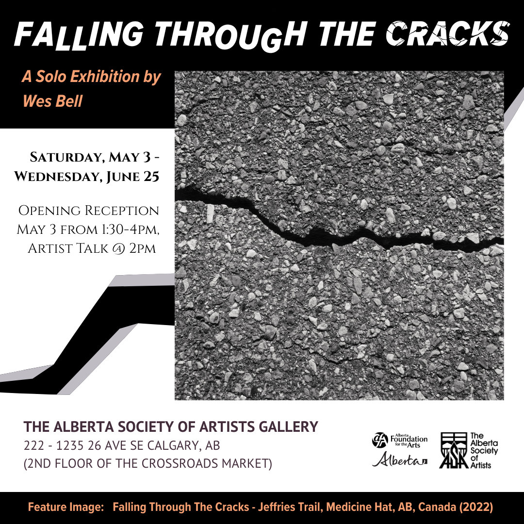 After repeated visits to the Emergency Department at our hospital, an ER physician looked me square in the eyes and said, "You're lucky you are alive. You could have died... I'm sorry, but you fell through the cracks." Not long after that, I had emergency surgery. After three months of recuperating at home, gingerly tending to the seven-inch diagonal incision on my abdomen as it healed into a permanent scar, I finally ventured outside for my first walk of the winter season. Treading cautiously into the howling Chinook wind, my head was tucked downward while my eyes remained focused on the ground with every calculated step I took. I started noticing large cracks in the wind-dried asphalt pathway. They were jagged, pronounced, precise—almost surgical. Recalling the ER physician's unforgettable words, the series Falling Through the Cracks began to take shape.
